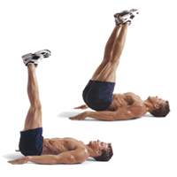 This abs exercise targets both the lower abs and the obliques. Lie on your back, with your legs raised directly over your hips. Your knees should be slightly bent. Place your hands at your sides with the palms down. Use your lower abs to raise your hips off the floor and toward your rib cage, elevating your feet straight up. Simultaneously twist your hips to the right. Hold, then return to the starting position. Repeat, twisting to the left. Do 10 repetitions to each side.