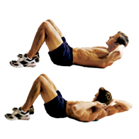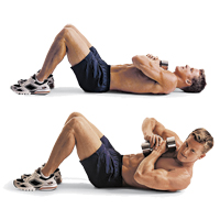 This abs exercise targets your upper abs. Lie on your back with your knees bent and your feet flat on the floor. Hold a light dumbbell in each hand and extend your arms straight back beyond your head. Now crunch your rib cage toward your pelvis, keeping your shoulders still and your arms straight. Don't generate momentum with your arms. Perform 12 to 15 repetitions.