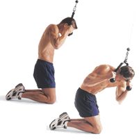 Kneel facing the pulley and hold the ends of a rope attached to the high cable along the sides of your face. Bend forward, aiming your chest at your pelvis. Return to the starting position, then repeat the movement, this time aiming your chest toward your left knee. Return, then repeat to your right. That's one repetition. Perform three sets of eight repetitions.